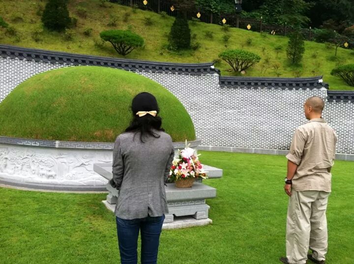 聖和2周年の時に文鮮明師のお墓の前で祈禱される。亨進師とヂエ様